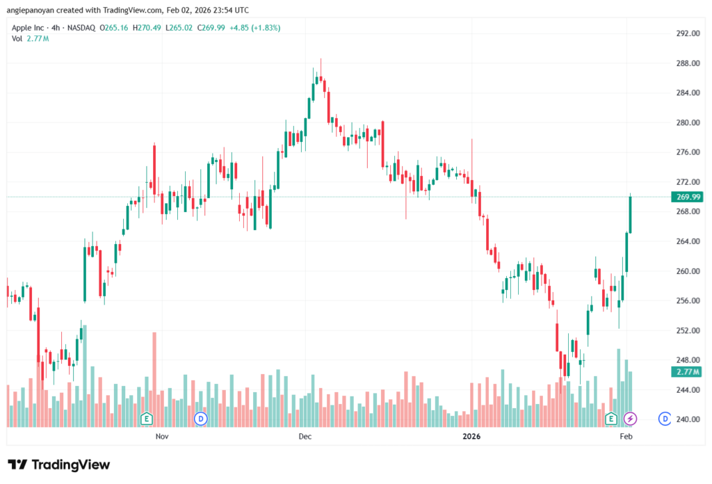 توصية شراء سهم ابل تنص على الدخول فوق نقطة الارتكاز 266.57 وجني الأرباح عند الأهداف التالية: 273.93, 277.86