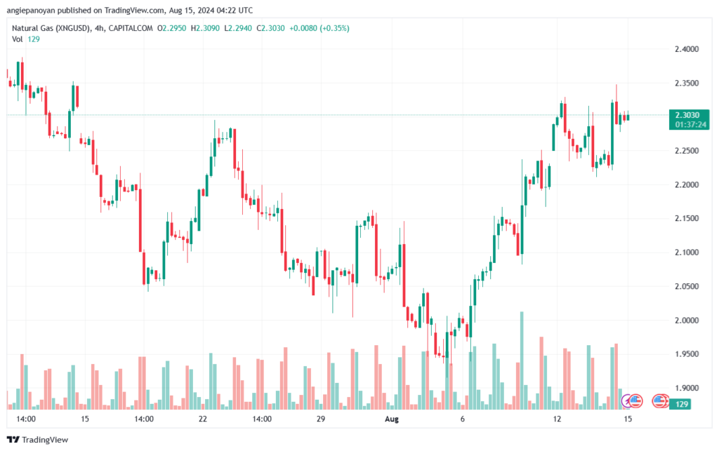 توصية شراء الغاز الطبيعي تنص على الدخول فوق نقطة الارتكاز 2.2166 وجني الأرباح عند الأهداف التالية: 2.2888, 2.3478, 2.4200