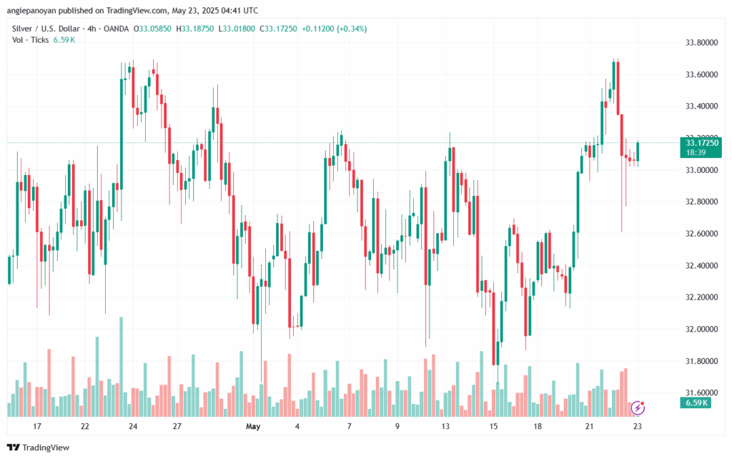 توصية شراء الفضة تنص على الدخول فوق نقطة الارتكاز 33.121 وجني الأرباح عند الأهداف التالية: 33.63, 34.212, 34.721 على التوالي.