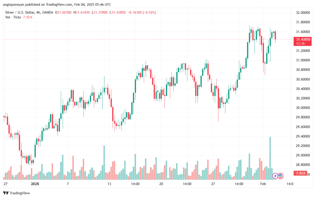 توصية شراء الفضة تنص على الدخول فوق نقطة الارتكاز 31.391 وجني الأرباح عند الأهداف التالية: 31.634, 31.961, 32.203