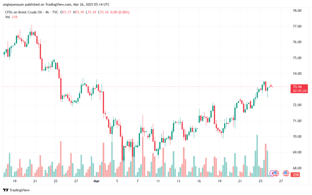 توصية شراء خام برنت تنص على الدخول فوق نقطة الارتكاز 73.086 وجني الأرباح عند الأهداف التالية: 73.668, 74.148, 74.730.