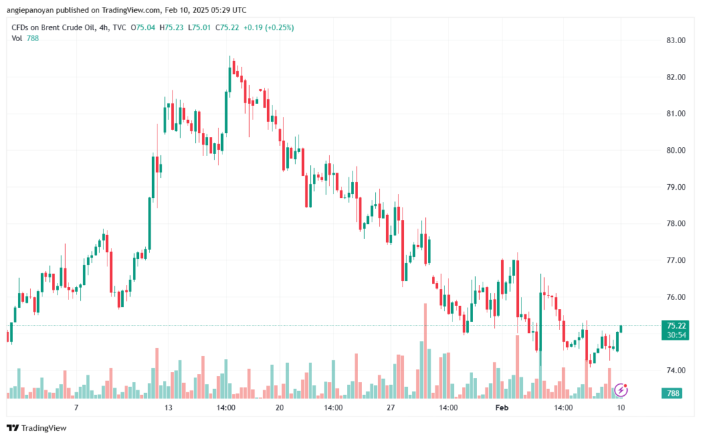 توصية شراء خام برنت تنص على الدخول فوق نقطة الارتكاز 74.57 وجني الأرباح عند الأهداف التالية: 75.045, 75.865, 76.336