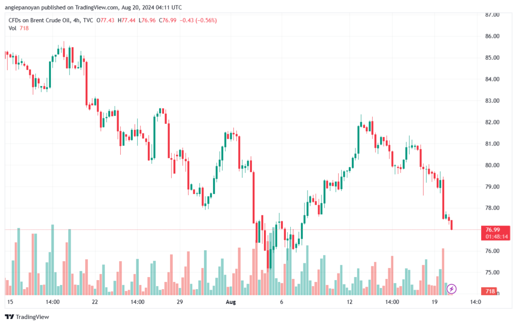 توصية بيع خام برنت تنص على الدخول ادنى نقطة الارتكاز 78.334 وجني الأرباح عند الأهداف التالية: 76.914, 76.064, 74.644