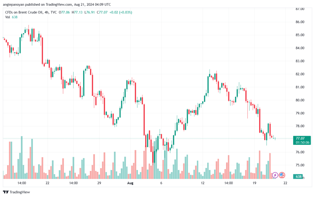 توصية شراء خام برنت تنص على الدخول فوق نقطة الارتكاز 77.349 وجني الأرباح عند الأهداف التالية: 78.144, 79.134, 79.929