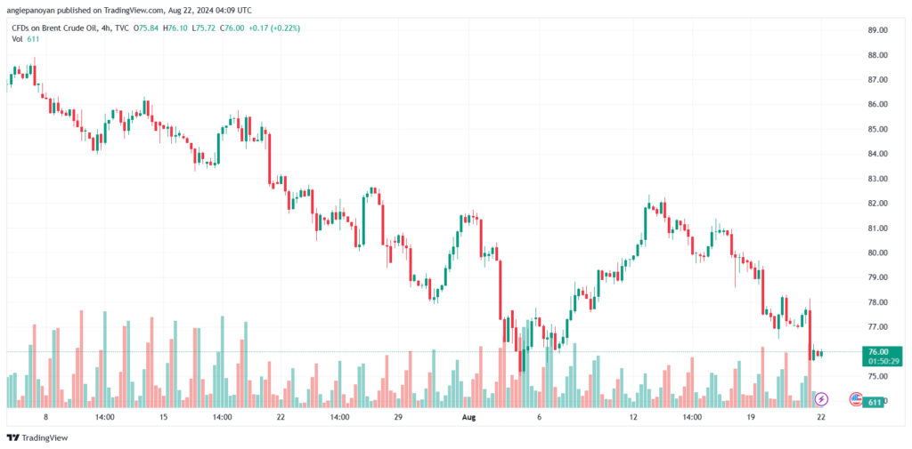 توصية بيع خام برنت تنص على الدخول ادنى نقطة الارتكاز 77.349 وجني الأرباح عند الأهداف التالية: 76.359, 75.564, 74.574