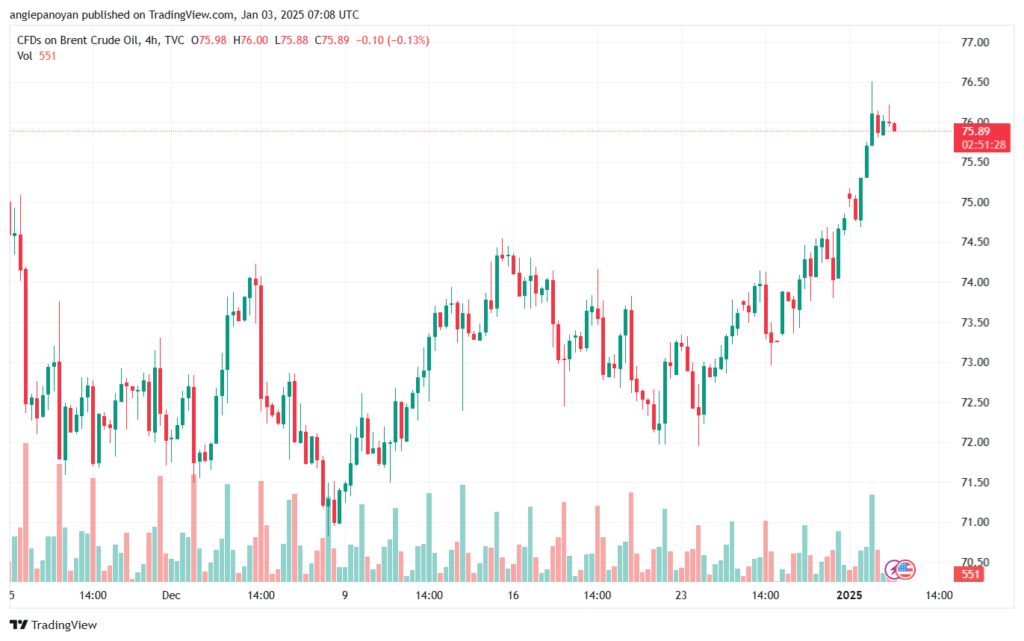 توصية شراء خام برنت تنص على الدخول فوق نقطة الارتكاز 75.722 وجني الأرباح عند الأهداف التالية: 75.722, 77.543, 78.54