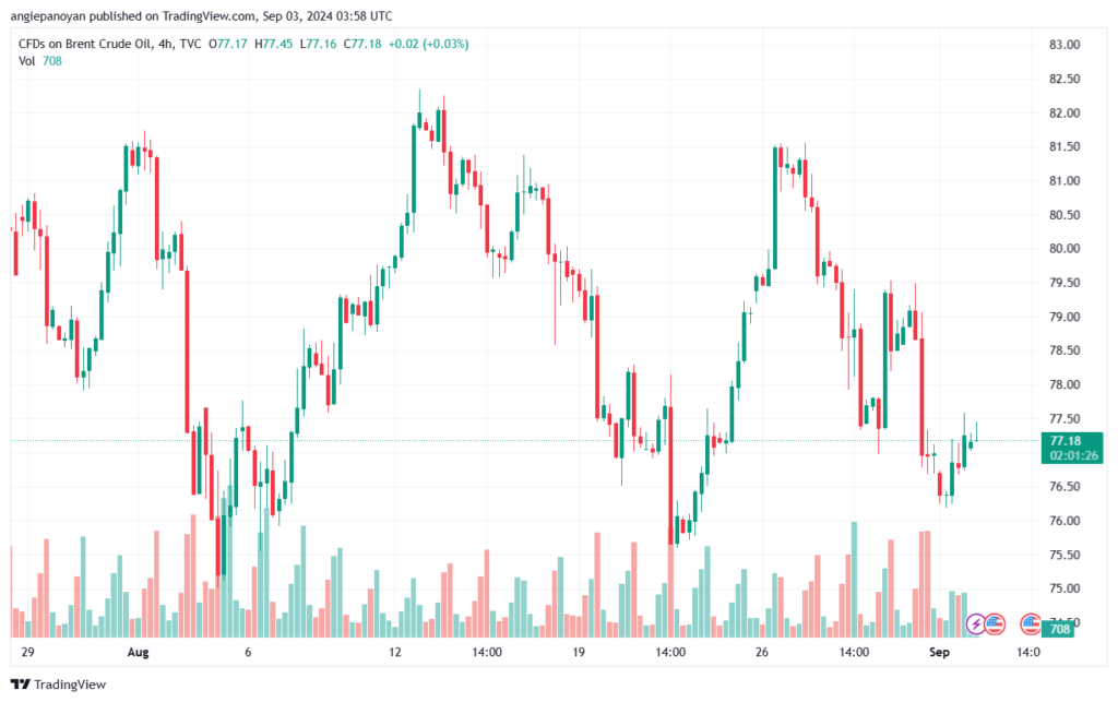 توصية بيع خام برنت تنص على الدخول ادنى نقطة الارتكاز 77.737 وجني الأرباح عند الأهداف التالية: 75.948, 74.915, 73.126