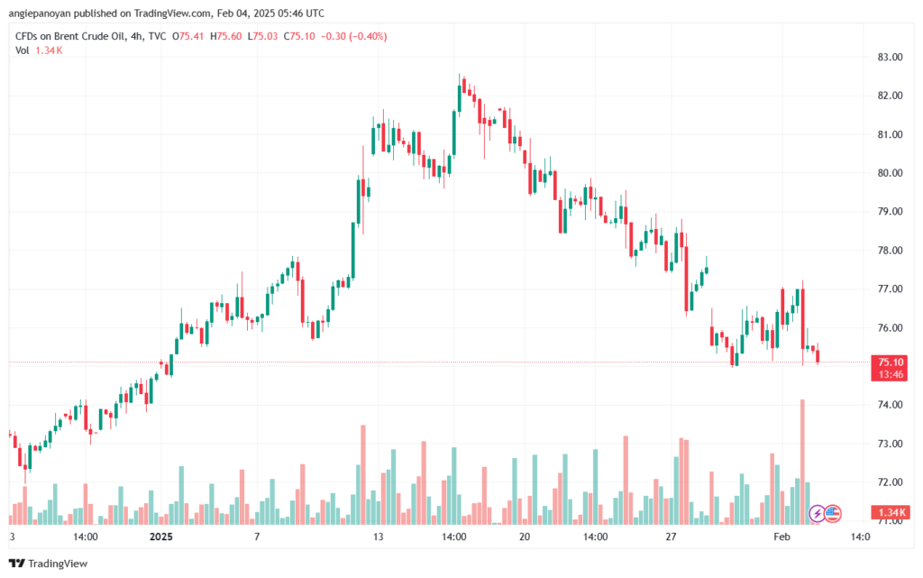 توصية بيع خام برنت تنص على الدخول ادنى نقطة الارتكاز 76.046 وجني الأرباح عند الأهداف التالية: 75.598, 74.716, 74.268