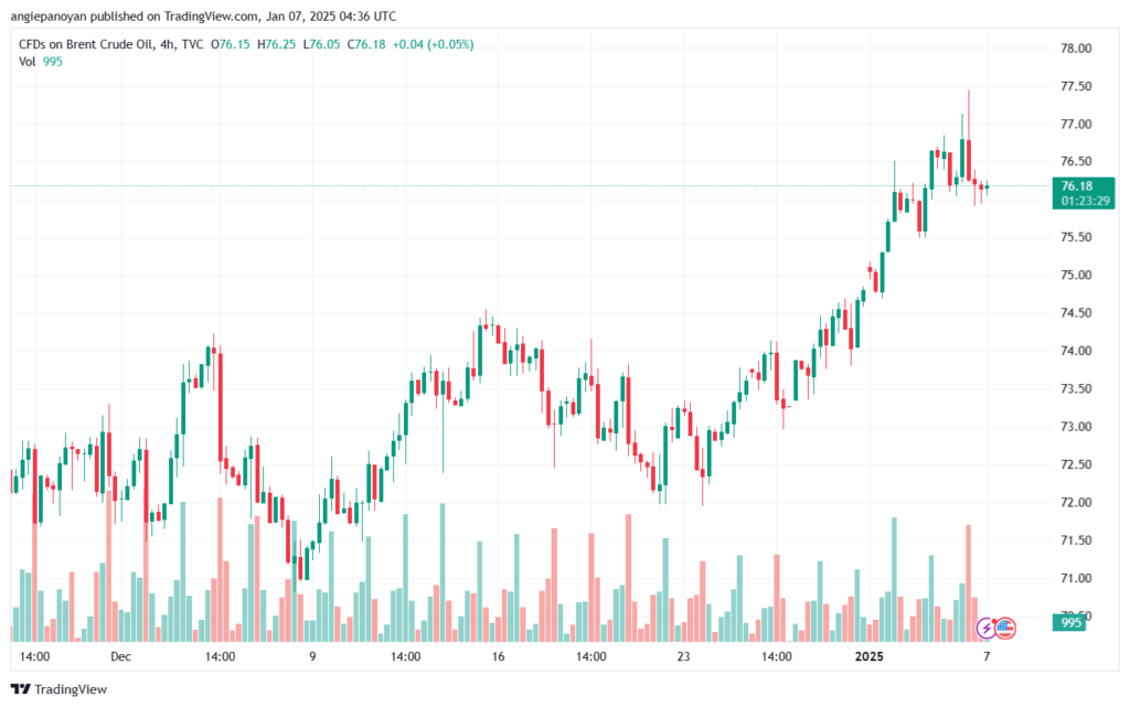 توصية شراء خام برنت تنص على الدخول فوق نقطة الارتكاز 76.284 وجني الأرباح عند الأهداف التالية: 76.284, 77.495, 78.254