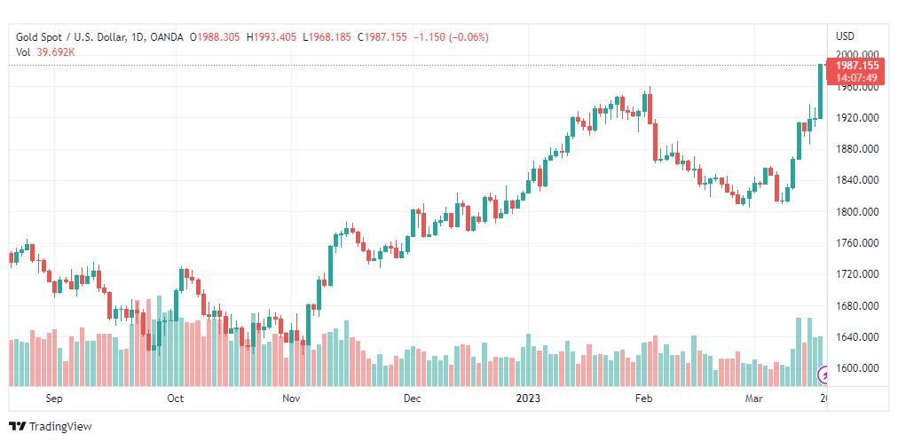 حققت أسعار الذهب (الرمز: XAUUSD) ارتفاعات قوية جديدة لتتخطّى هدفنا المنتظر عند 1960.00 وتقترب من الحاجز النفسي عند 2000.00 دولار، وهذا الشيء يزيد من فرص استمرار الاتجاه الصاعد على المدى اللحظي والقصير. مع الإشارة إلى أن تخطّي الحاجز المذكور سيدفع السعر للتوجه نحو مناطق 2040.00 كمحطة رئيسية تالية.