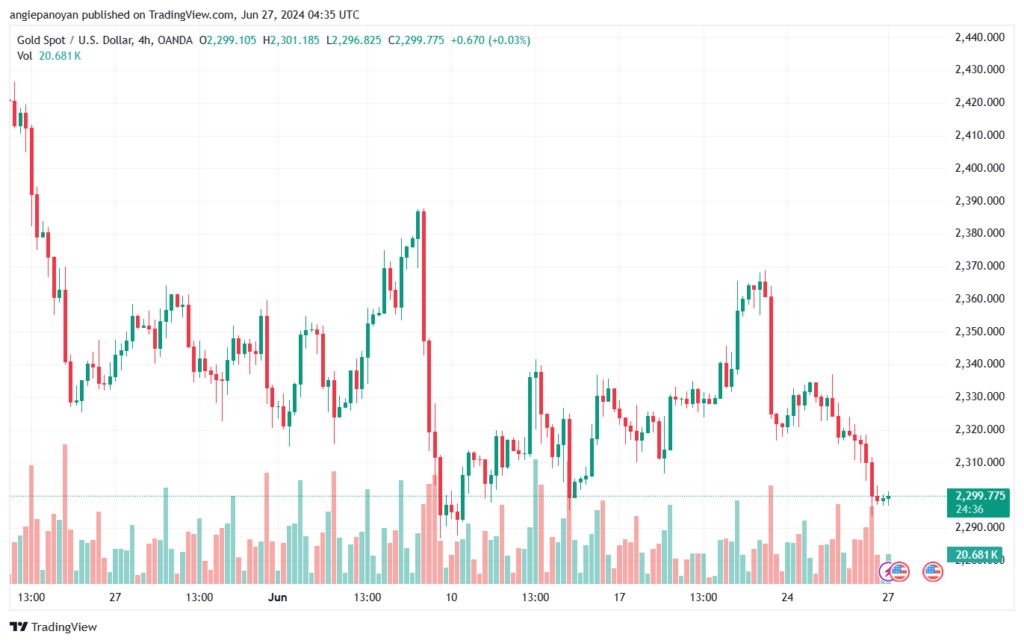 قدّم سعر الذهب الرمز (XAUUSD) تداولات سلبية ملحوظة يوم أمس ليتجاوز حاجز 2300.00$، مما عزز التوقعات باستمرار الاتجاه التصحيحي الهابط، وفتح الطريق أمام تحقيق هدفنا المنتظر عند 2272.06$، والذي يمثل مستوى 38.2% فيبوناتشي للارتفاع الذي يظهر بالرسم البياني، مما يعني أن كسره سيدفع السعر نحو 2217.10$ كهدف سلبي تالي.