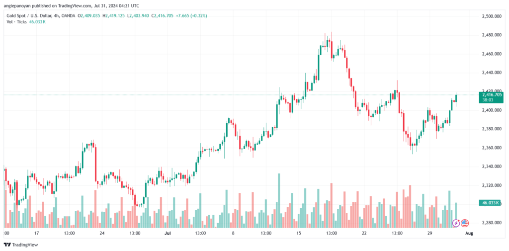 توصية شراء الذهب تنص على الدخول فوق نقطة الارتكاز 2400.142 وجني الأرباح عند الأهداف التالية: 2423.763, 2436.607, 2460.228