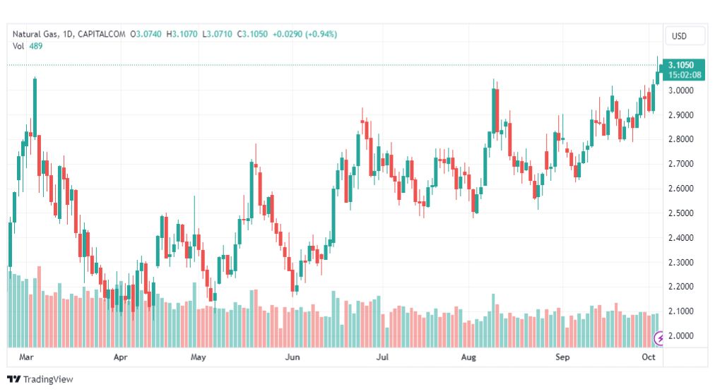 يذكر ان سعر الغاز الطبيعي (الرمز: NG) بدأ باستقبال العزم الإيجابي الإضافي نظرا لاندفاع مؤشر ستوكاستيك نحو مستوى 80 مشكلا بذلك زحف إيجابي جديد ليقترب من الهدف المستقر عند 3.100 كما هو واضح بالرسم المرفق.