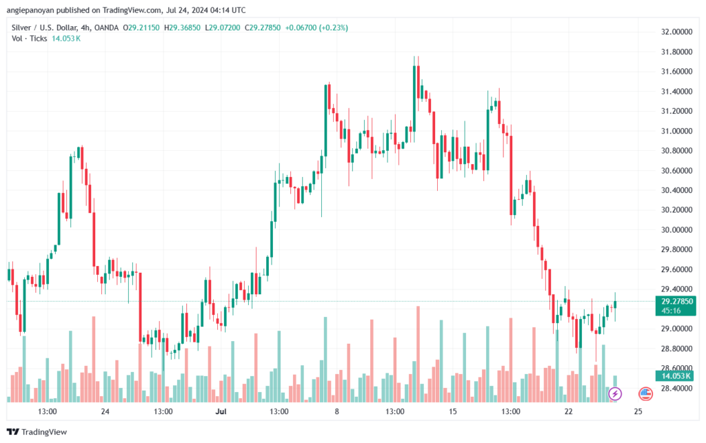 توصية شراء الفضة تنص على الدخول فوق نقطة الارتكاز 29.066 وجني الأرباح عند الأهداف التالية: 29.469, 29.709, 30.112
