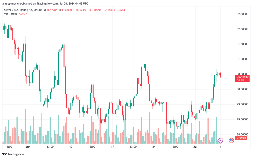 تستقر تداولات سعر الفضة الرمز (XAGUSD) حول مستوى 30.40$ بعد الارتفاع القوي الذي شهده يوم أمس، بانتظار الحصول على زخم إيجابي يساهم في دفع السعر لمواصلة الارتفاع وتحقيق هدفنا الإيجابي التالي عند 31.00$.