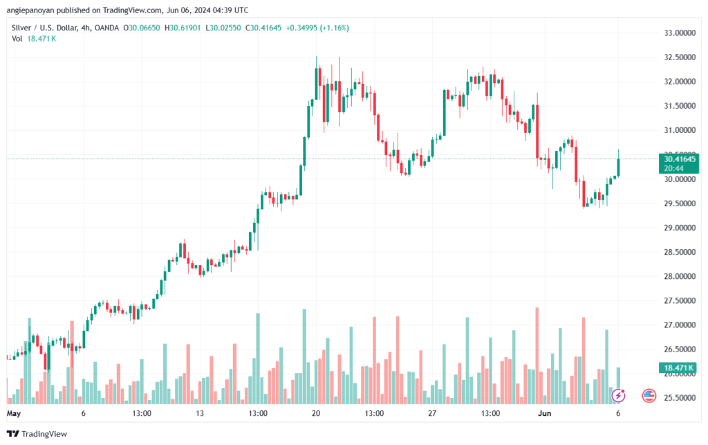 يبدأ سعر الفضة الرمز (XAGUSD)تداولات اليوم بارتفاع ملحوظ، حيث يتجاوز مستوى 30.06$ ويغلق شمعة الأربع ساعات الأخيرة فوقه. هذا يقدم إشارات عن التوجه للتعافي ومحاولة تأكيد إيقاف التصحيح الهابط. نرجح تحقيق مكاسب تبدأ بـ اختبار مستوى 31.00$ وتمتد إلى 31.75$ كمحطة إيجابية تالية بعد تجاوز المستوى السابق.