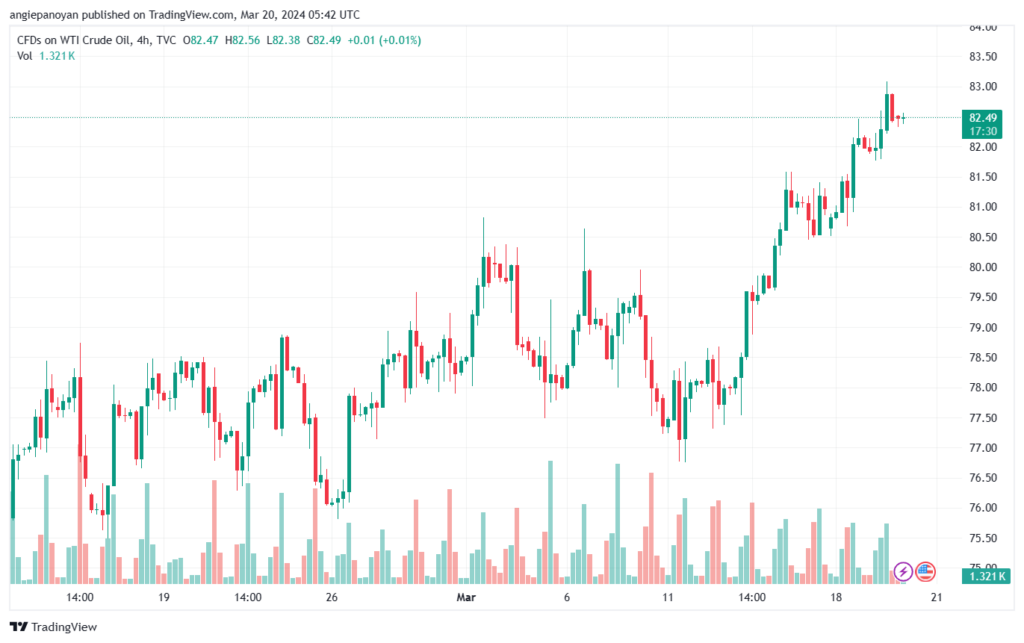 قدم سعر نفط خام تكساس الرمز (CL) مزيدًا من التداولات الإيجابية يوم أمس، مما جعله يقترب من هدفنا الجديد المتوقع عند مستوى 83.85، واستمراره في التحرك داخل القناة الصاعدة يعزز فرص تحقيق مزيد من المكاسب على المدى اللحظي والقصير. يجب التذكير أن محطتنا التالية تصل إلى مستوى 86.00.