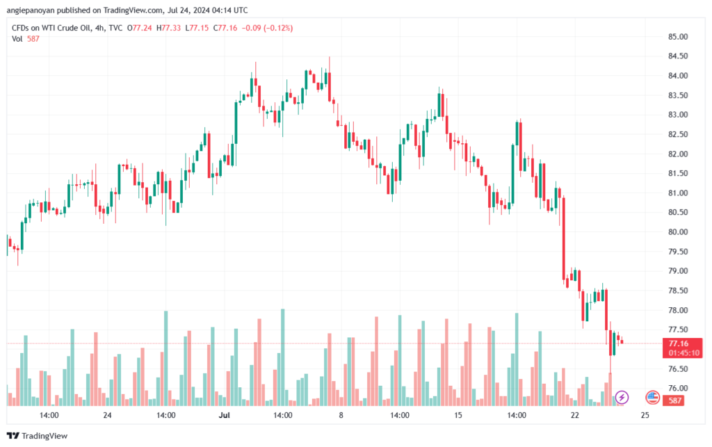 توصية بيع النفط تنص على الدخول ادنى نقطة الارتكاز 77.532 وجني الأرباح عند الأهداف التالية: 76.338, 75.205, 74.011