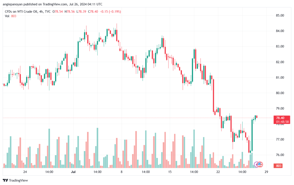 توصية شراء النفط تنص على الدخول فوق نقطة الارتكاز 77.618 وجني الأرباح عند الأهداف التالية: 79.202, 80.059, 81.643