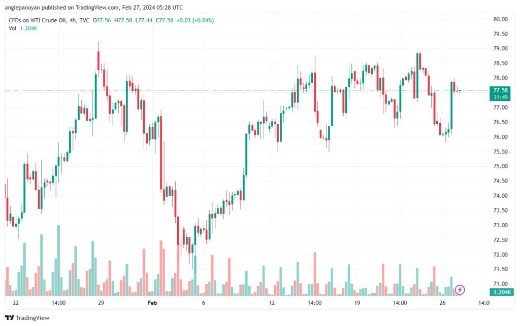 أنهى سعر نفط خام تكساس الرمز (CL) تداولات يوم أمس فوق مستوى 77.00، مما يشير إلى تحقيق مكاسب متوقعة على المدى اللحظي واستعادة المسار الرئيسي الصاعد. يستهدف السعر اختبار مستوى 78.75 في البداية، ومن الممكن أن يتجاوزه، مما يؤكد استمرارية الارتفاع ويدفع السعر نحو مناطق 80.00 دولار للبرميل.