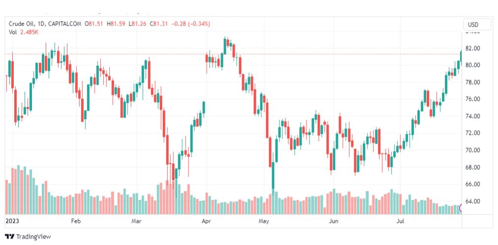 حسب ما ورد فان سعر نفط خام تكساس (الرمز: CL) اندفع صعوداً بشكل جيد يوم أمس ليلامس حاجز 82.00 دولار، معززاً التوقعات باستمرار الاتجاه الصاعد على المدى اللحظي والقصير، مع الإشارة إلى أن الأهداف التالية تبدأ عند 82.65 وتمتد إلى 83.50.