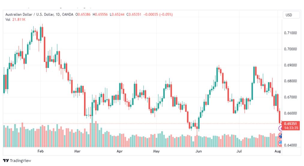 يذكر ان عملة الدولار الأسترالي مقابل الأمريكي (الرمز: AUDUSD) واصل الانخفاض ليصل إلى مستوى 0.6550، ونلاحظ أن السعر كسره وأنهى تداولات يوم أمس دونه، فاتحاً الطريق أمام مواصلة الانخفاض والتوجه لتحقيق أهداف سلبية إضافية تصل إلى مناطق 0.6400.