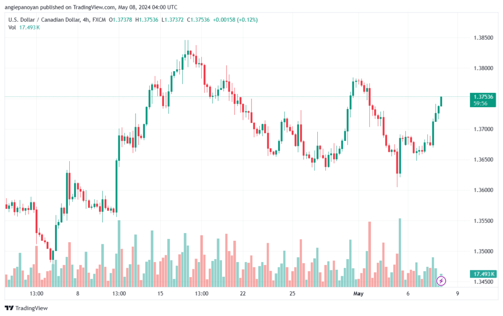 يتجه سعر عملة الدولار الامريكي مقابل الكندي (الرمز USDCAD) نحو الارتفاع الملحوظ نحو الهدف المتوقع عند 1.3845$ بعد اختراق مستوى 1.3705$، وذلك مع إلغاء تأثير نموذج القمة المزدوجة. ومن المهم متابعة اختراق مستوى 1.3760$ لتسهيل مهمة السعر في تحقيق الارتفاع المتوقع، مع الانتباه إلى أن كسر 1.3705$ قد يضع السعر تحت الضغط السلبي من جديد.