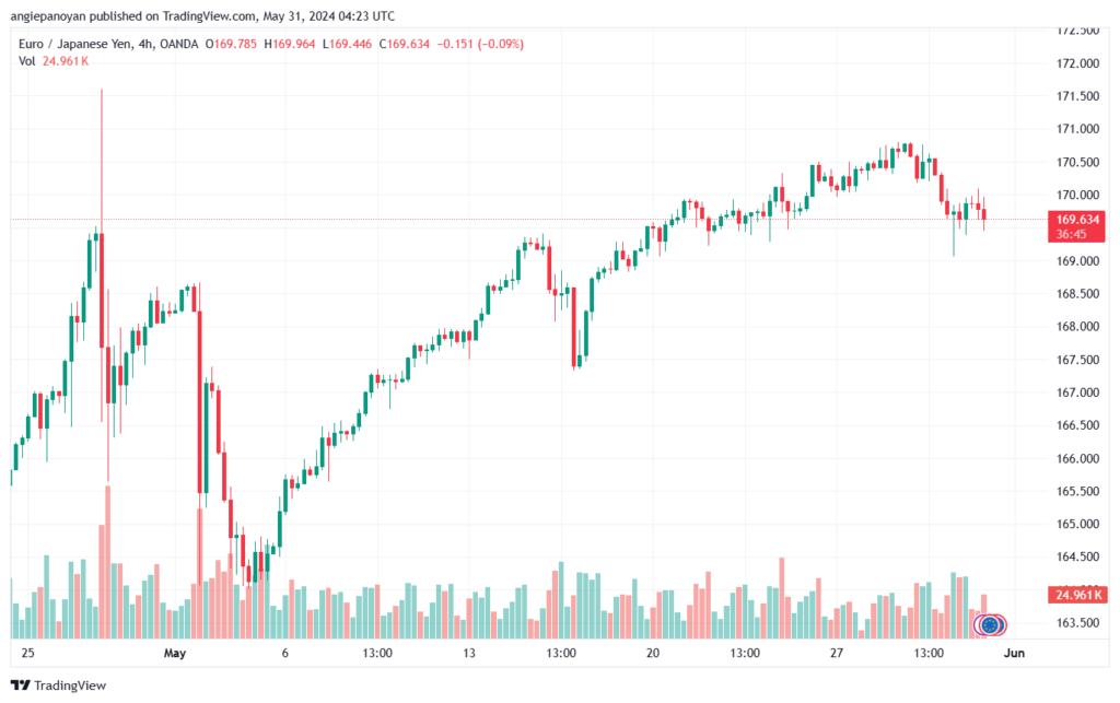 انهى سعر زوج عملة اليورو مقابل الين الياباني الرمز (EURJPY) الهجوم التصحيحي الهابط في تداولات يوم أمس بلامسته لمستوى 169.05، ثم ارتد بسرعة ليختبر الحاجز المتمثل بمستوى 170.10 ومحور المتوسط المتحرك 55.