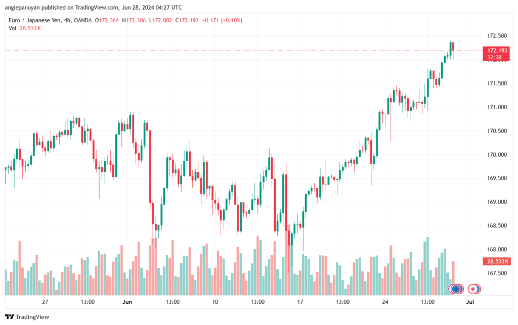 بعدما نجح سعر زوج عملة اليورو مقابل الين الياباني الرمز (EURJPY) يوم أمس بالخروج عن المسار الجانبي، حقق اختراقًا للحاجز المستقر عند 171.60، وبلغ بذلك مكاسب إيجابية جديدة عند 172.40، مما يؤكد استعداده لاستئناف الهجوم الصاعد من جديد.