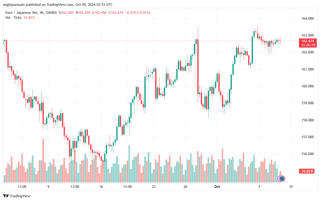 توصية شراء يورو/ين ياباني تنص على الدخول فوق نقطة الارتكاز 162.836 وجني الأرباح عند الأهداف التالية: 163.38, 164.12, 164.664
