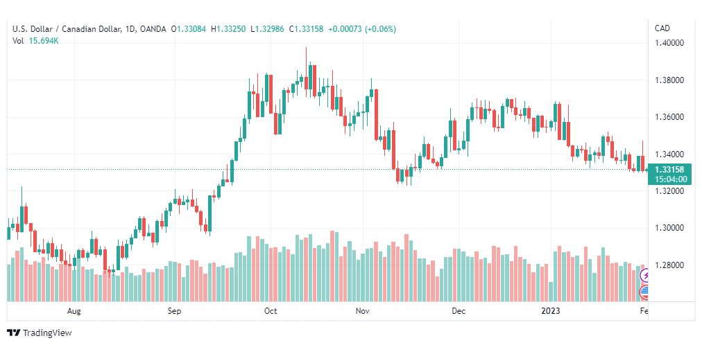 زوج الدولار الأمريكي مقابل الدولار الكندي في حالة انخفاض