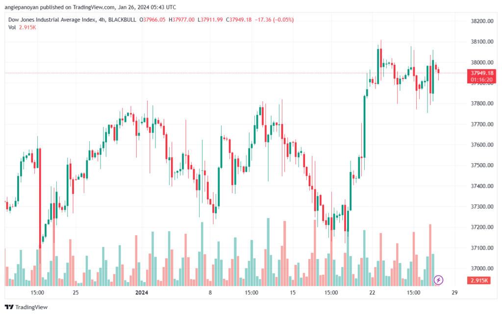 ظل سعر مؤشر داو جونز للأسهم الامريكية الصناعية (الرمز DJI) ثابتًا في تداولات الصباح اليوم، حيث استمر في التذبذب فوق الدعم الأولي الذي يمتد نحو 37890. يُلاحظ محاولته مواجهة السلبية المتجسدة في مؤشر ستوكاستيك، والتي تتعارض مع الثبات العام داخل الاتجاه الصاعد.