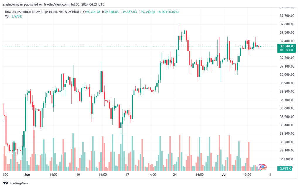 لم يتمكن سعر مؤشر داو جونز للأسهم الامريكية الصناعية (الرمز DJI)  من تحقيق أي مستوى إيجابي جديد، حيث تأثر بثبات الحاجز المستقر عند 39550، مما أدى إلى تشكيل تداولات جانبية جديدة واستقراره حالياً قرب 39400.