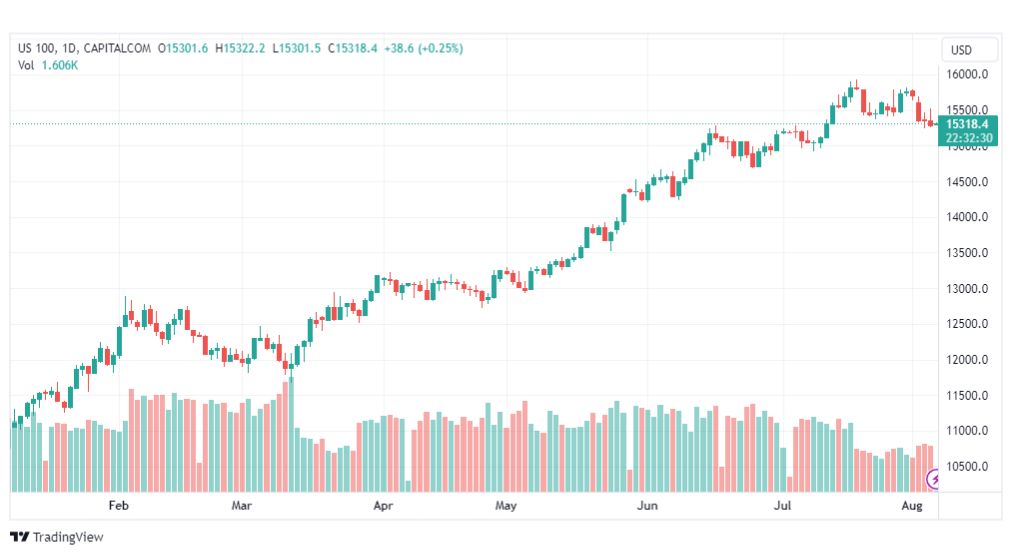 حسب ما ورد فان مؤشر ناسداك للأسهم الامريكية التكنولوجية (الرمز: NASDAQ) فعّل السيناريو التصحيحي الهابط ليبدأ بجني بعض الأرباح بعد ملامسته مؤخرا لمستوى 16060.00 لنلاحظ من الرسم المرفق تسلله نحو 15338.00 ليحافظ بذلك على استقراره دون الحاجز الإضافي المتمثل بمستوى 15655.00.