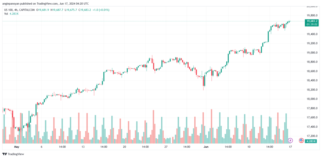 لا يزال سعر مؤشر ناسداك للأسهم الامريكية التكنولوجية (الرمز NASDAQ) مستقراً فوق الدعم الإضافي عند 19680.00 حتى الآن، محققاً مكاسب تاريخية جديدة بملامسة مستوى 19985.00 والاستقرار بالقرب منه.