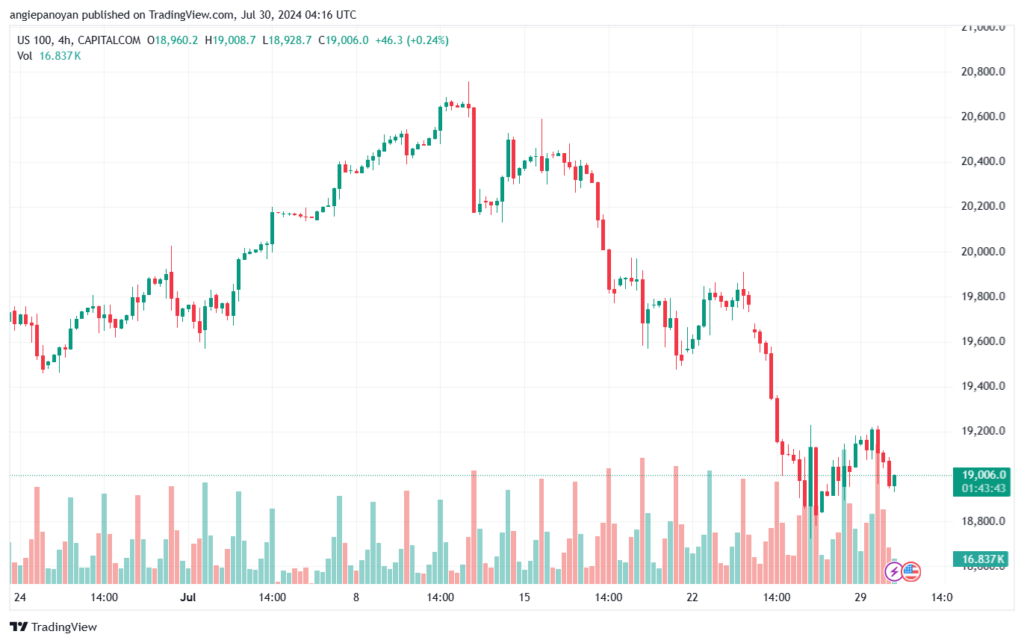 توصية بيع مؤشر ناسداك تنص على الدخول ادنى نقطة الارتكاز 19114.823 وجني الأرباح عند الأهداف التالية: 18975.197, 18851.193, 18711.567.