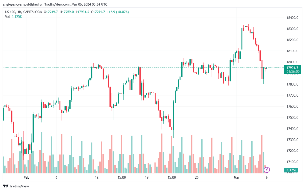 انهى سعر مؤشر ناسداك للأسهم الامريكية التكنولوجية (الرمز NASDAQ) الهبوط التصحيحي المؤقت بعد اختباره للدعم الأولي المستقر عند مستوى 17800.00، ومن ثم ارتد مباشرة نحو مستوى 17980.00 بهدف تأكيد السيناريو الصاعد للتداولات القادمة كما كان متوقعًا سابقًا.