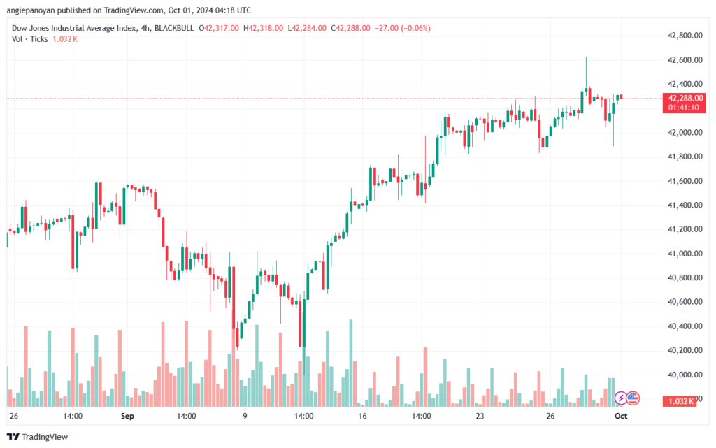 توصية شراء مؤشر داو جونز تنص على الدخول فوق نقطة الارتكاز 42427.79 وجني الأرباح عند الأهداف التالية: 42649.29, 42942.79, 43164.29
