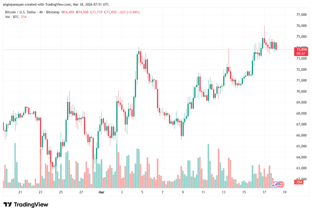 توصية بيع عملة البتكوين تنص على الدخول ادنى نقطة الارتكاز 74647.8 وجني الأرباح عند الأهداف التالية: 73296.85, 72060.05, 70709.1 على التوالي.