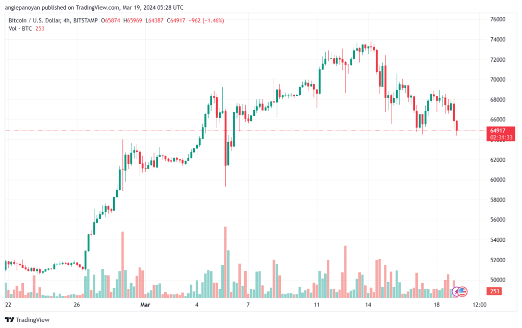 نطاق التداول المتوقع لهذا اليوم يتراوح بين مستوى الدعم 65000.00 ومستوى المقاومة 67500.00.