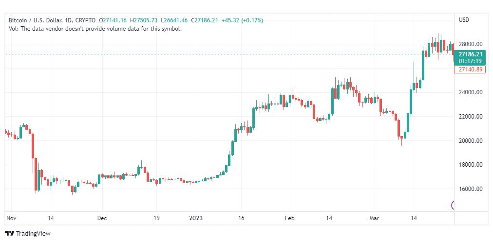 يذكر ان تداولات سعر عملة البتكوين (الرمز:BTC) ارتدت بشكل صاعد بعد التماسك فوق مستوى 26658.10، ليتجه نحو اختبار محتمل لمستوى المقاومة الذي يظهر بالرسم البياني أعلاه، والذي يتواجد الآن عند 27710.00، ويواجه تعارضاً بين العوامل الفنية يجعلنا نفضّل التزام الحيادية إلى أن يؤكد السعر تخطّي أحد المستويات المذكورة ومن ثم تحديد وجهته التالية بشكل أدق.