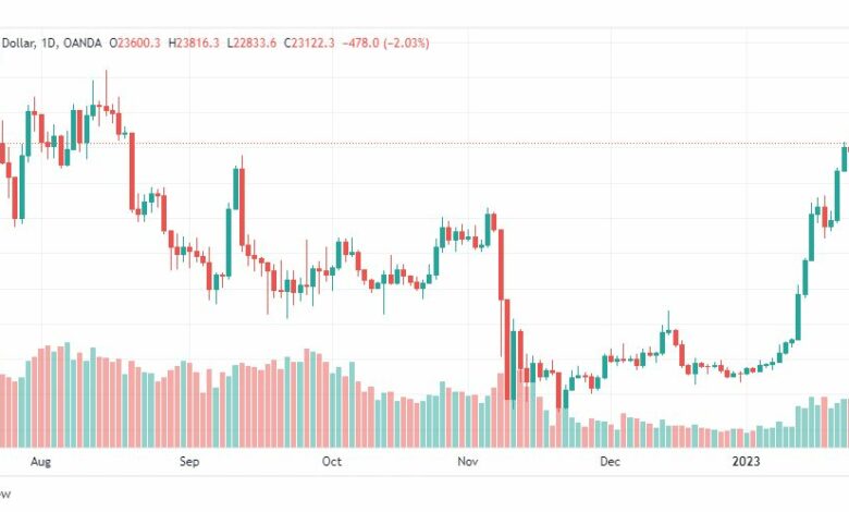 أكمل القراءة »البيتكوين (BTCUSD) في اتجاه ميل هابط يذكر ان سعر البيتكوين (BTCUSD) مستمر بالانخفاض ليكسر مستوى 23155.00 ويستقر دونه، ليجري تصحيح…
