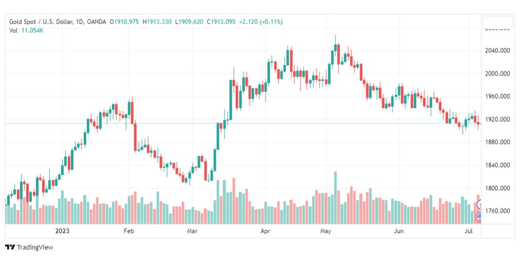 يذكر ان سعر الذهب (الرمز: XAUUSD) أنهى تداولات يوم أمس دون مستوى 1913.15، ليؤكد استمرار سيطرة الاتجاه الهابط على المدى اللحظي والقصير، ويحاول العودة إلى القناة الهابطة التي تظهر بالرسم البياني، بانتظار مزيد من الانخفاض لزيارة مستوى 1873.50 الذي يمثّل محطّتنا السلبية التالية.