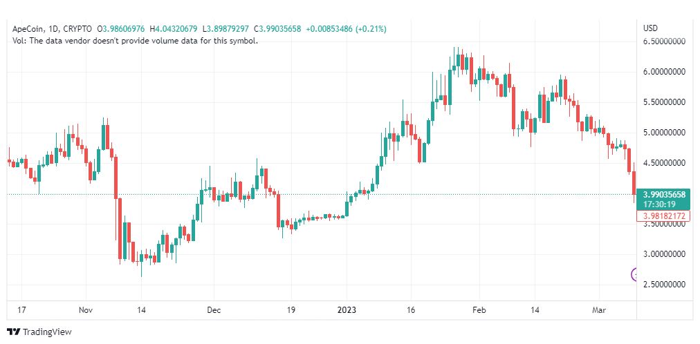 يذكر ان زوج عملة أبكوين دولار أمريكي (الرمز: APEUSD) قد استقر على انخفاض بتداولاته الأخيرة على المستويات اللحظية، وذلك وسط تأثر الزوج بكسره لخط ميل تصحيحي صاعد في وقت سابق، مع استمرار الضغط السلبي لتداولاته دون المتوسط المتحرك البسيط لفترة 50 يوماً السابقة، ليكسر الزوج أيضاً بتداولاته الأخيرة مستوى الدعم 4.483.